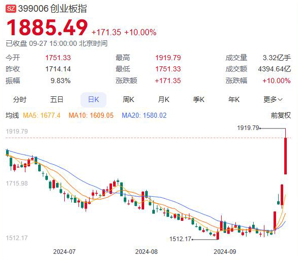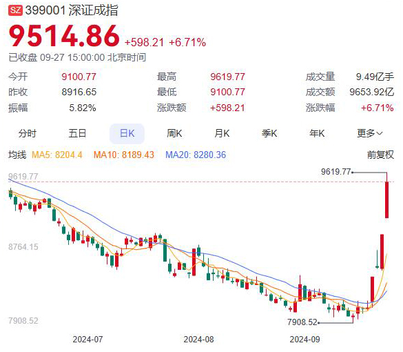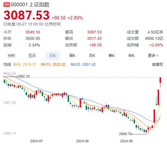 9月27日收盘,沪指涨2.89%逼近3100点,深证成指涨6.71%,创业板指涨10%,创历史最大单日涨幅,成交额亦刷新历史纪录。两市成交额超1.4万亿,较昨日放量近3000亿,连续三个交易日突破万亿。北证50收涨11.14%。
