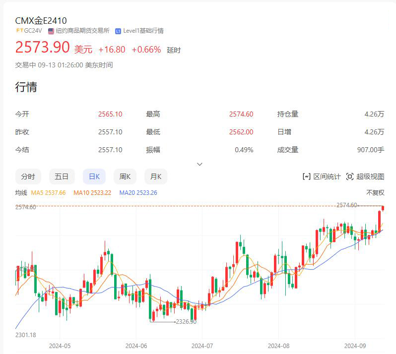 随着一系列美国经济数据出炉,现货黄金价格拉升近40美元,最高涨至每盎司2551.69美元,续刷历史新高;CMX金E2410也是同步上涨。年初至今,金价已累涨超23%。