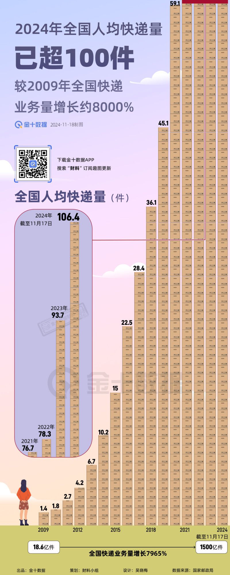 截至11月17日,2024年全国快递业务量已经超过1500亿件,相当于每人106件。这一数字较2009年已经增长了近8000%……