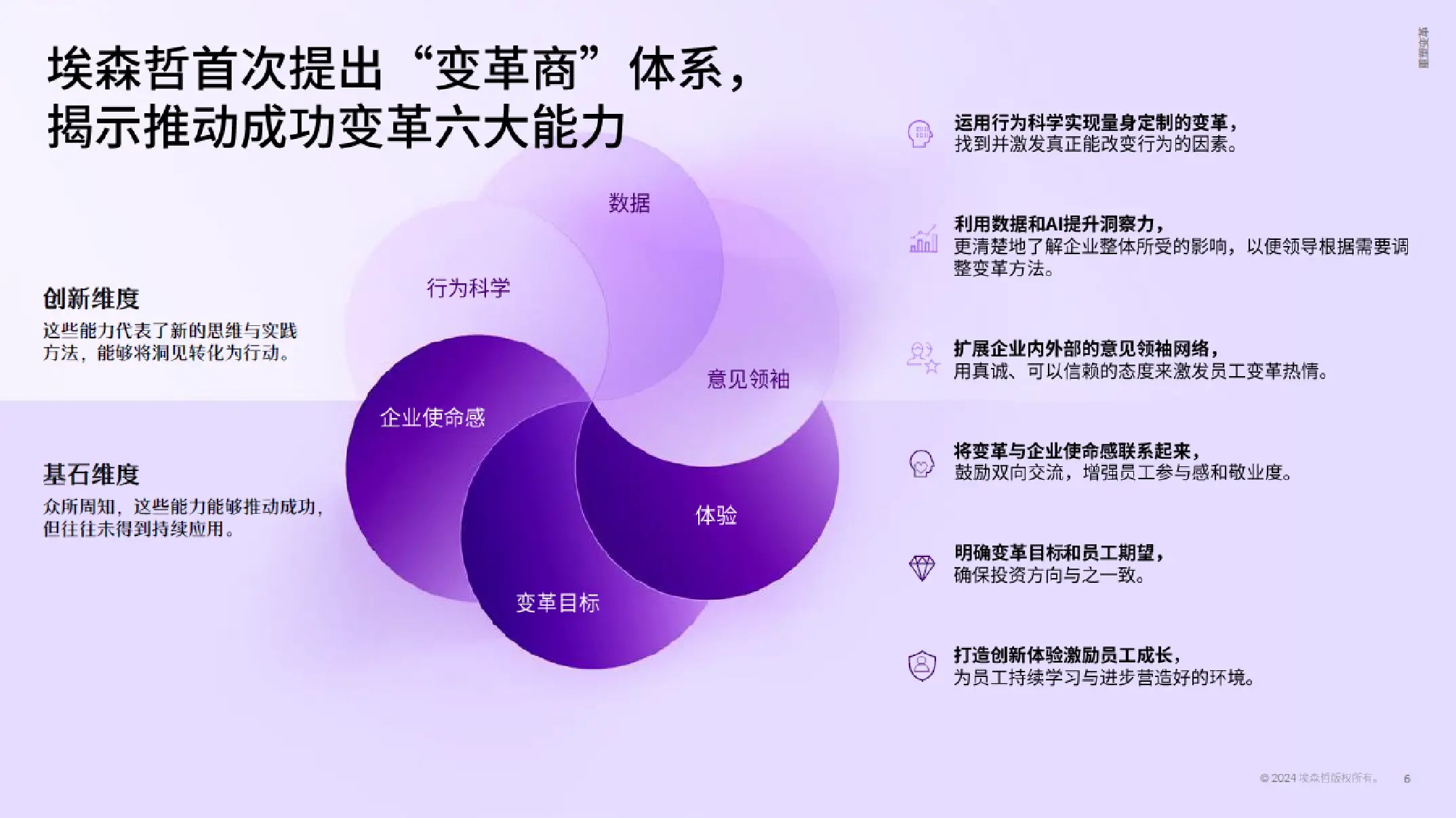 埃森哲在本次《重塑变革——新蓝图:实现持续和高效的成功变革》的研究中首次揭示了推动成功变革的六大能力,使得企业领导者能够更为系统地把握变革进程。这些能力分为基石和创新两个维度,基石层面包括那些经过实践验证的方法,创新维度则涵盖了由技术、数据和人工智能驱动的新思维和新做法。
