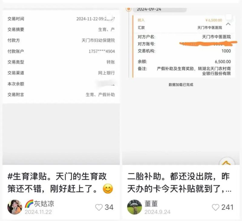 “都还没出院,昨天办的卡今天补贴就到了……”抖音平台上,有天门宝妈晒出自己的银行到账截图。