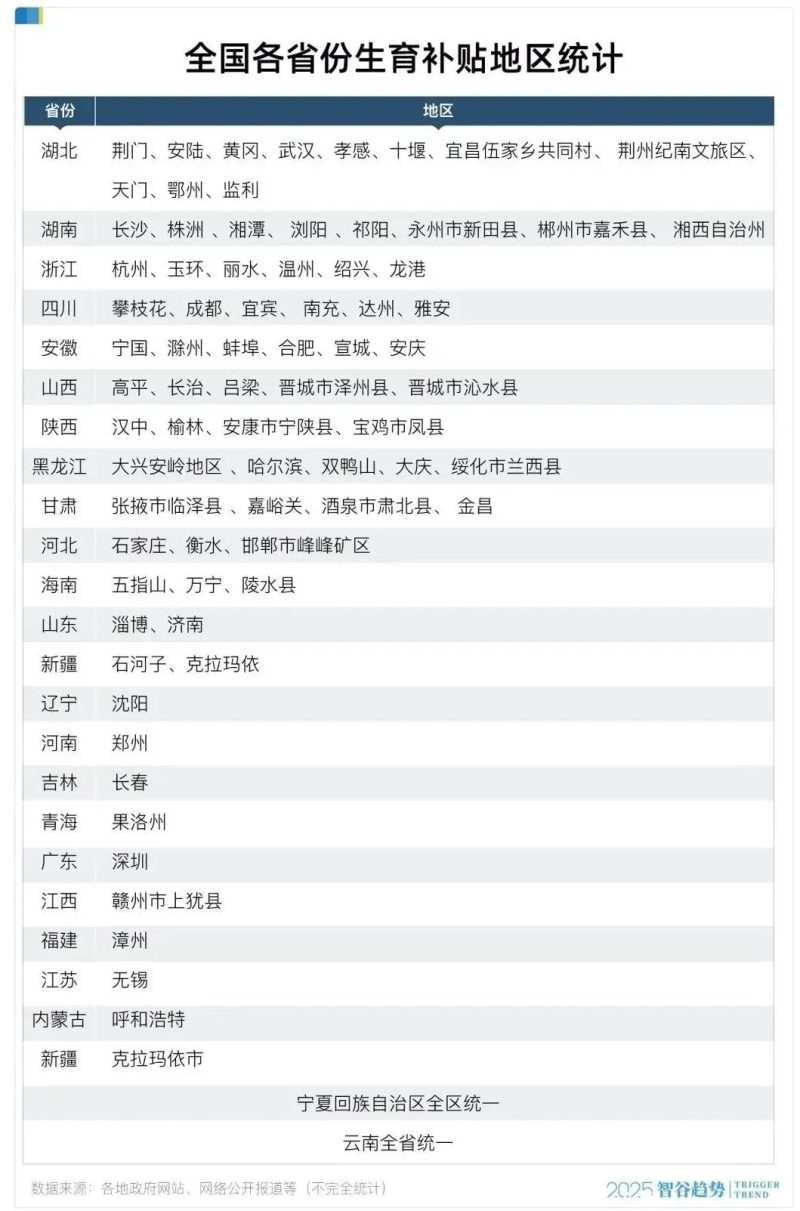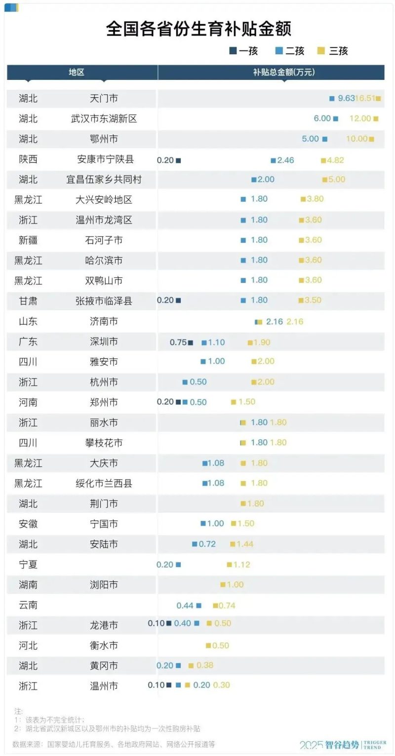 仔细梳理会发现,湖北省不仅有天门,还有相当多的城市都在鼓励生育这件事上,使出了洪荒之力。从出台生育补贴的城市数量,到补贴的力度,湖北都是全国独一档。