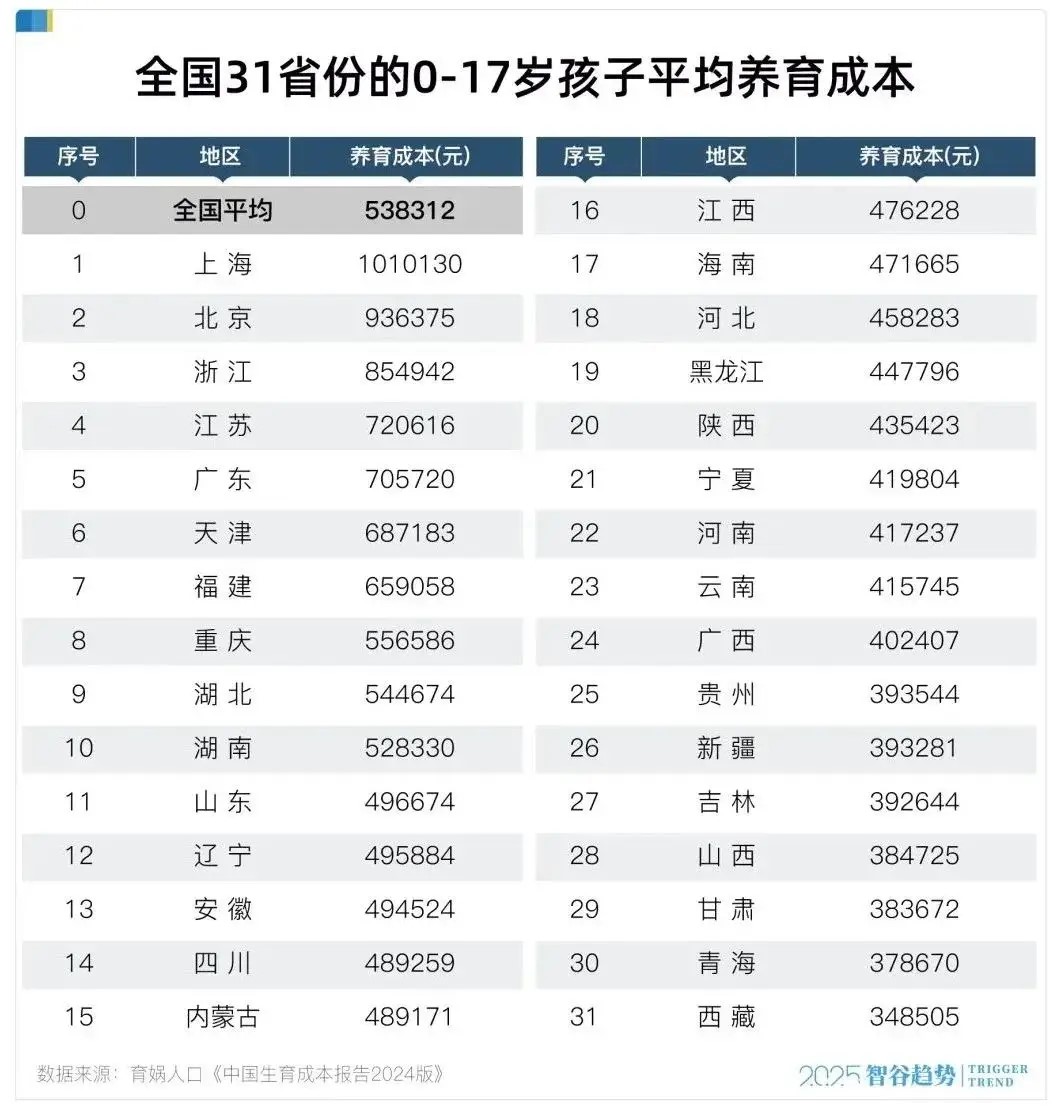 这也不难理解,毕竟大城市生育成本高,小城市生育成本更低。育娲人口的《中国生育成本报告2024》显示,全国家庭0-17岁孩子的养育成本平均为53.5万元。上海平均养育成本最高,养1个就得101万元,够湖北人养2个娃,够西藏人养3个娃了。