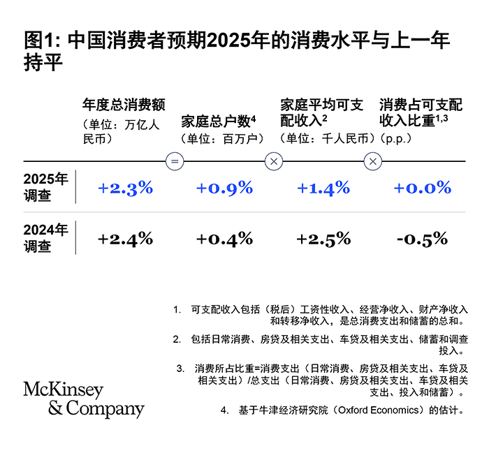 虽然这些指标积极,但受到家庭收入增长更为温和的预期影响。中国消费者对2025年家庭收入增长率的平均预期仅为1.4%,低于2024年的2.5% (见图1)。
