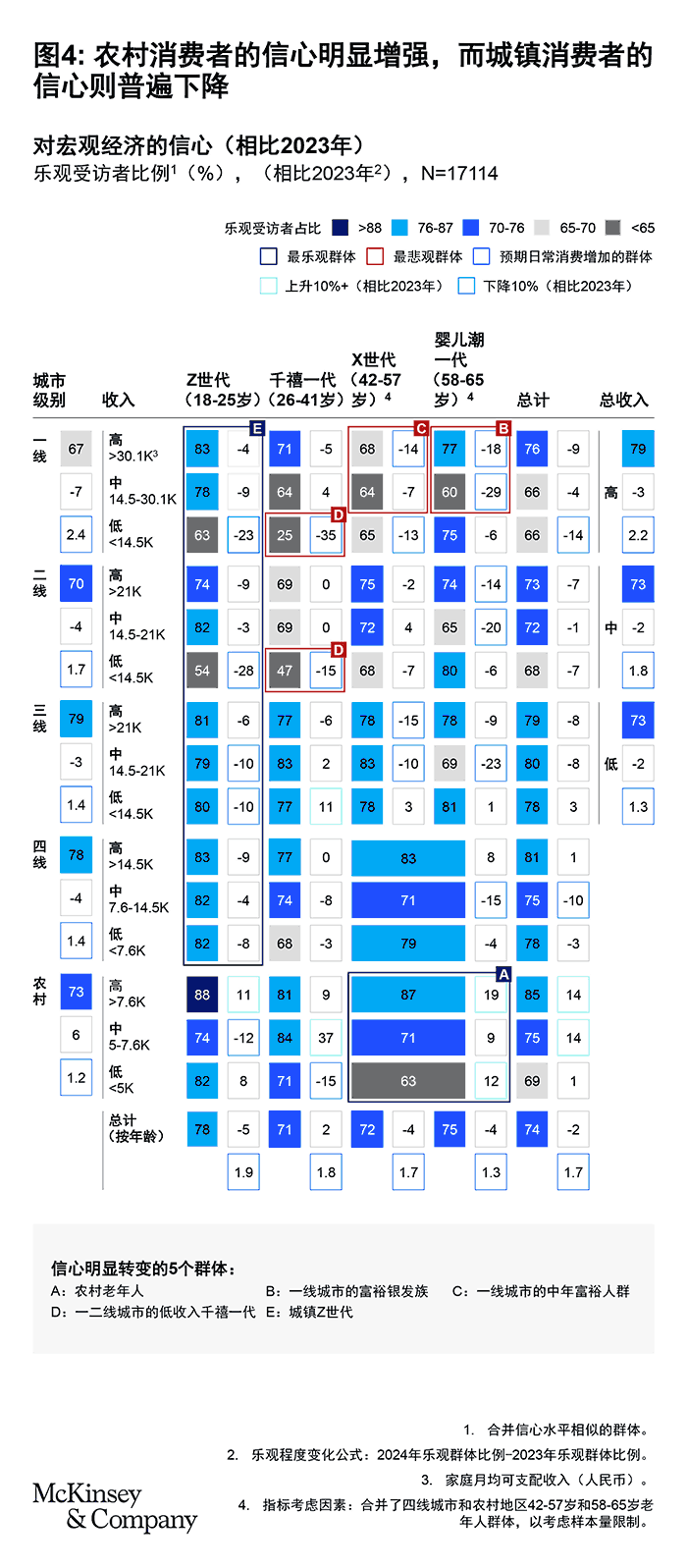 相比之下,城镇富裕老年消费者(曾经是最乐观的群体),由于资产贬值和企业表现不佳,信心下降了约20%。一线和二线城市低收入千禧一代仍然是最悲观群体,他们主要担心工作不稳定、生活成本上升和房产贬值。同时,对于三线城市消费者和城镇Z世代,虽然青年失业率居高不下和收入增长预期降低,导致他们的信心有所下降,但他们仍然是最乐观的群体(见图4)。