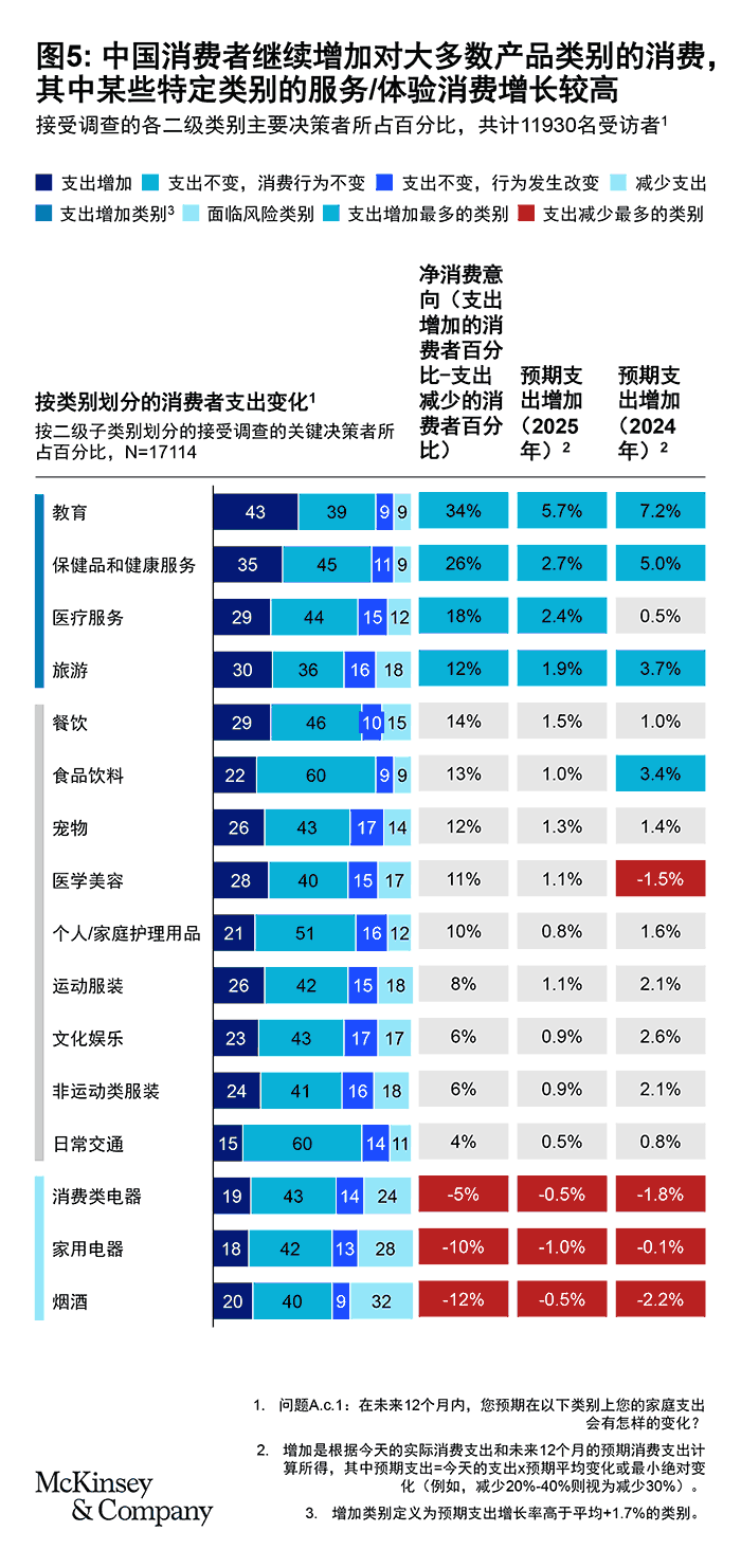 以富裕城镇消费者为例,虽然与其他消费群体相比,这一群体的信心水平似乎有所下降,但他们追求的是更高生活质量和更大个人成就,正因为此,该群体表示有意在2025年将日常支出增加2.6%。许多消费者有意动用储蓄来维持生活水平,这预示着他们的消费行为可能正回归正常。这些消费者有意把钱花在有形的大件商品上,例如新房、房屋装修和汽车,同时有意把更多钱花在无形的服务和体验上,以获得快乐和个人成就感(见图5)。