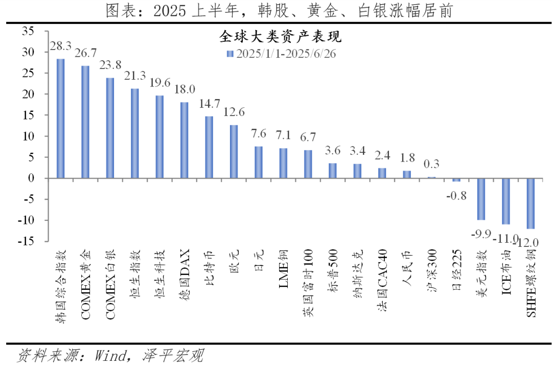 2025年上半年,非美市场股票、贵金属涨幅明显。2025年初至6月26日,涨幅居前的大类资产前5位是韩国综指28.34%、COMEX黄金26.71%、COMEX白银23.85%、恒生指数21.26%、恒生科技19.63%。贵金属涨幅受益于”去美元化”、避险情绪升温;韩国、香港、德国股指表现亮眼,年初美股回调,资本从美国外溢至其他市场找寻亮点。美元指数、原油、螺纹钢居后,涨幅-9.9%、-11%、-12%。