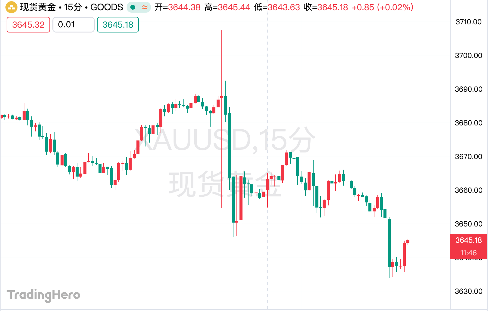 这导致现货黄金在利率决议公布后先快速上冲至3707美元/盎司,再创历史新高,随后从高点一度短线下挫最多近50美元,截至发稿日内下跌0.4%,报3645.18美元/盎司。