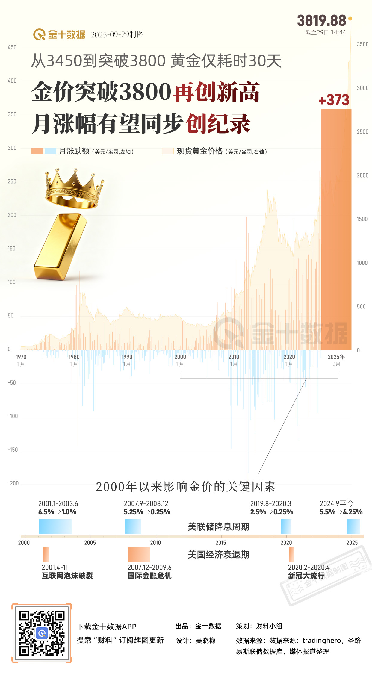金价突破3800再创纪录,月涨幅有望同步创纪录