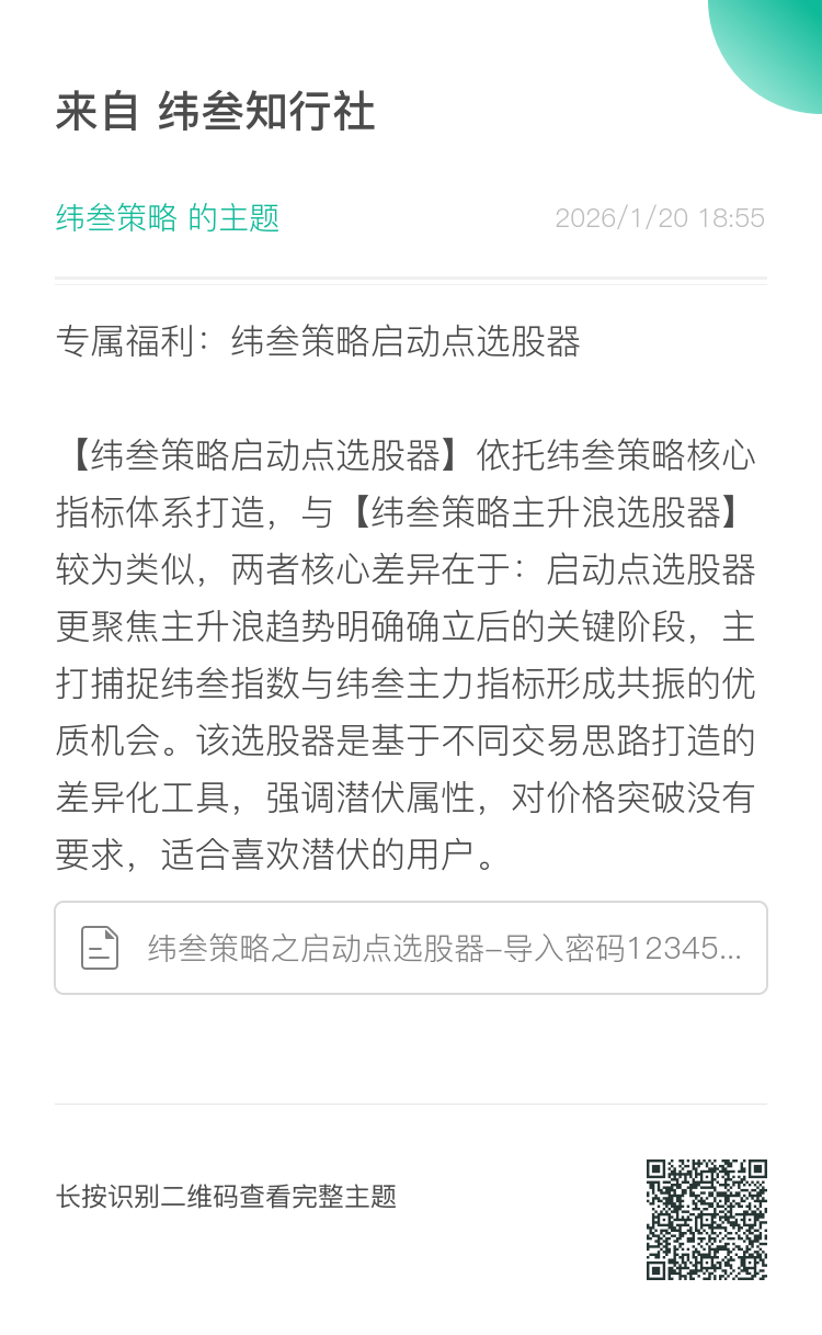 [纬叁策略启动点选股器]依托纬叁策略核心指标体系打造;与[纬叁策略主升浪选股器]较为类似,两者核心差异在于:启动点选股器更聚焦主升浪趋势明确确立后的关键阶段,主打捕捉纬叁指数与纬参主力指标形成共振的优质机会。