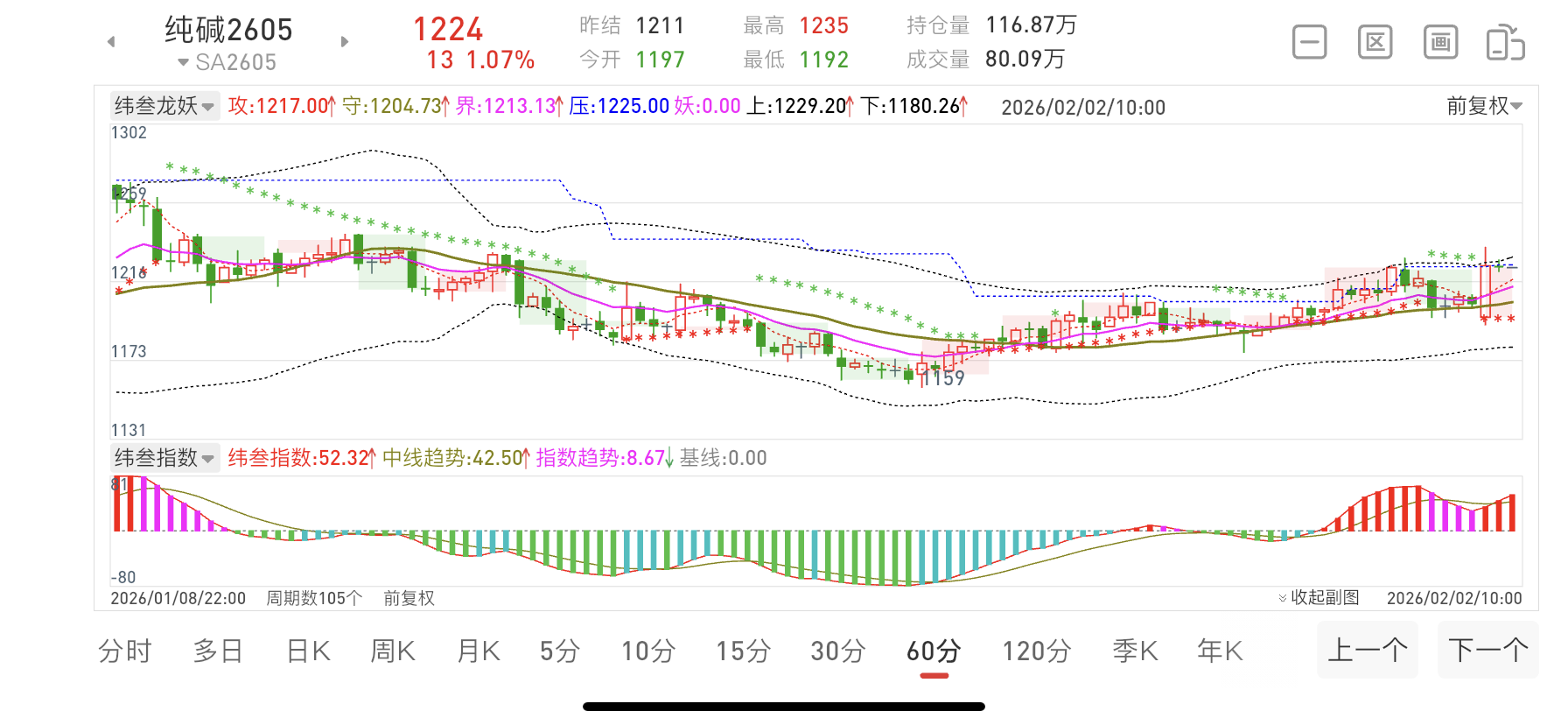 核心结论:1月26日至1月30日,纯碱2605合约呈触底反弹震荡走势,1月30日夜盘收于1224元/吨,周涨幅1.07%。结合供需、库存及机构观点判断,短期受商品情绪回暖及节前补库预期带动有反弹动作,但国内厂家库存高位累库、供大于求格局未改,叠加下游需求疲软,反弹空间有限,难现趋势性上涨,2月2日-2月6日该合约大概率维持震荡偏弱格局。