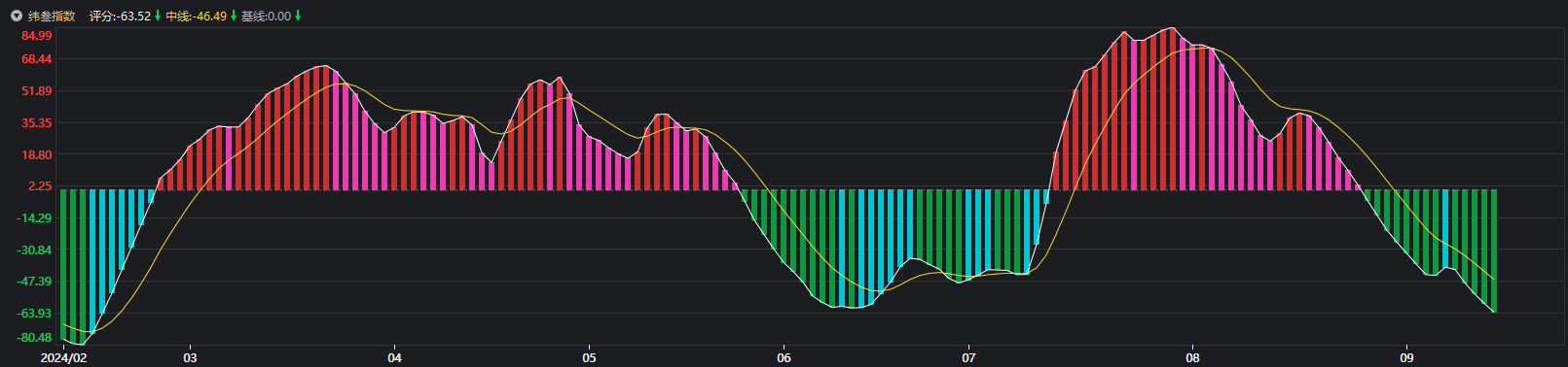 在输出具体参数时,为平衡各参数影响,经过了长时间调试,以最大限度匹配走势形态,确保在不同品种、不同周期下纬叁指数指标的普适性和稳定性。此外,为便于直观展示和应用,我们还将纬叁指数的评分参数和中线参数按不同颜色输出,旨在让指标能更加浅显易懂。