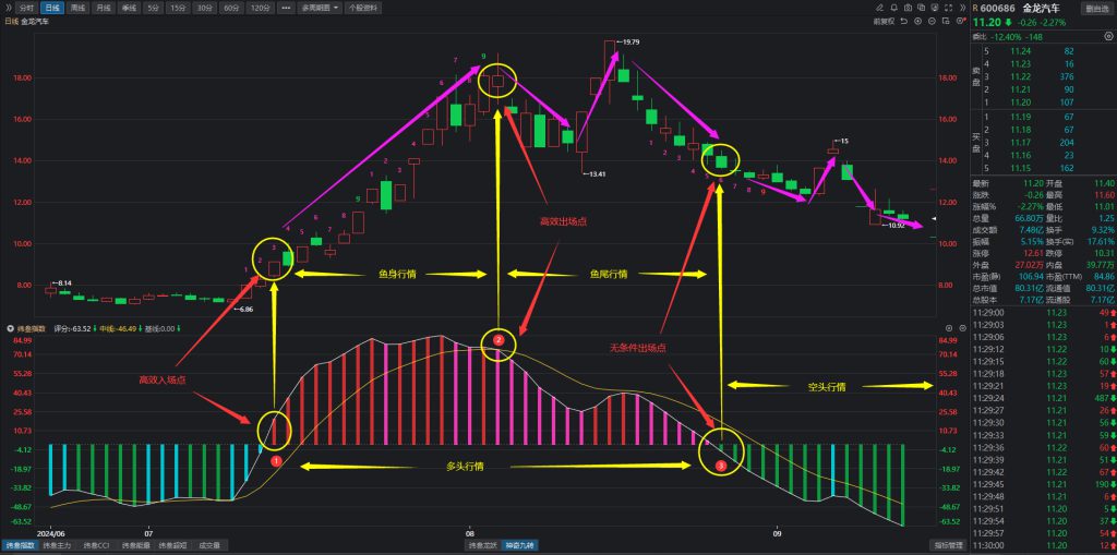 为更好把握是否见顶、见底等细节,还可参考评分参数与中线参数的相对位置关系,判断是否出现背离等情况,以便更好帮助把握行情;具体用法与MACD类似。